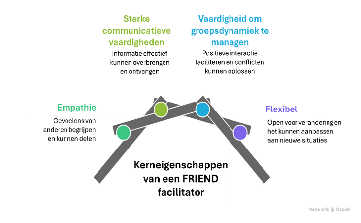 Wat de verantwoordelijkheden betreft, moet de FRIEND-facilitator een grondige kennis hebben van het programmamateriaal, de structuur en inhoud van de verschillende sessies en de specifieke doelstellingen en resultaten die het FRIEND-programma wil bereiken.