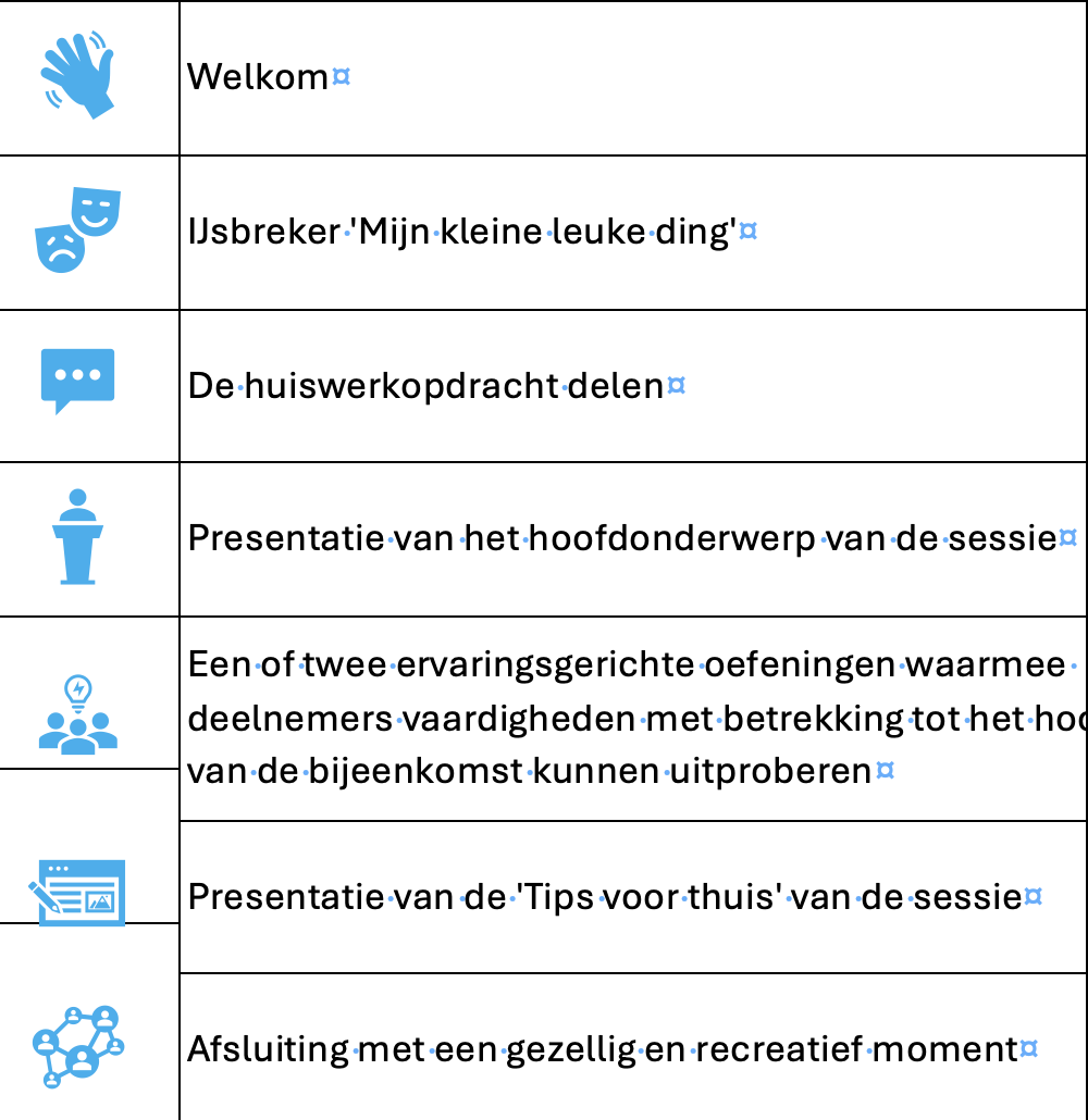 Elke bijeenkomst duurt twee uur, waarvan anderhalf uur wordt besteed aan de cursus en een half uur aan een recreatief moment, zoals een gezamenlijke snack.