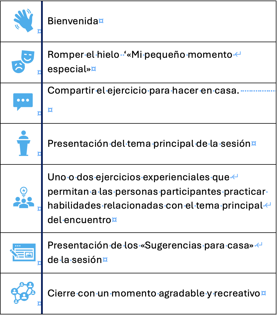 Las sugerencias para casa están disponibles en línea en la plataforma del proyecto FRIEND, o se pueden enviar por correo o WhatsApp, o también imprimir. Más adelante, en el Módulo 4, se ofrecerá una explicación detallada de cada una de las 7 sesiones, incluyendo el tema y el plan correspondiente.